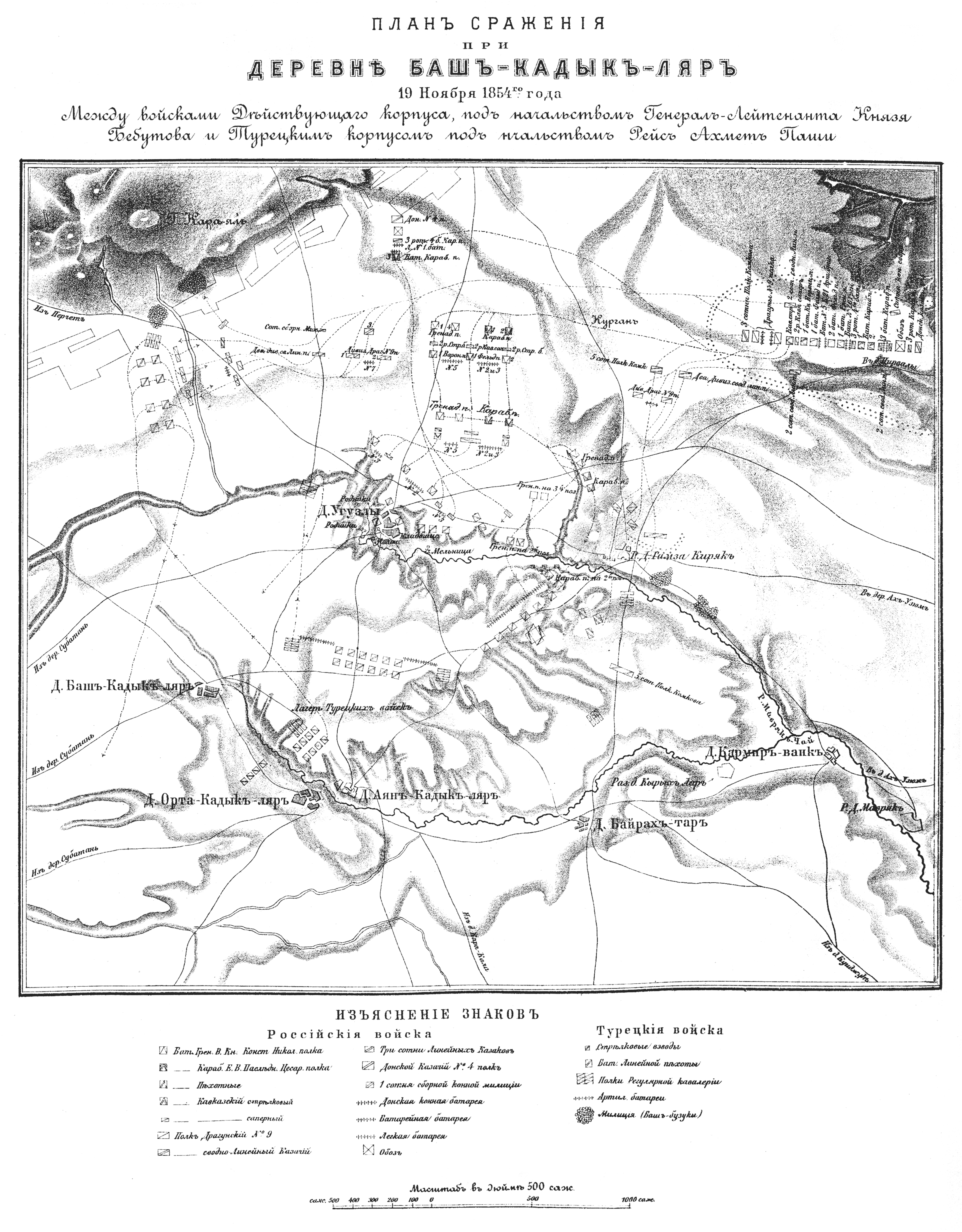 План сражения при деревне Баш-Кадык-Ляр 19 ноября 1854 года между войсками Действующего корпуса, под начальством Генерал-лейтенанта Князя Бебутова и Турецким корпусом под начальством Рейс Ахмет Паши