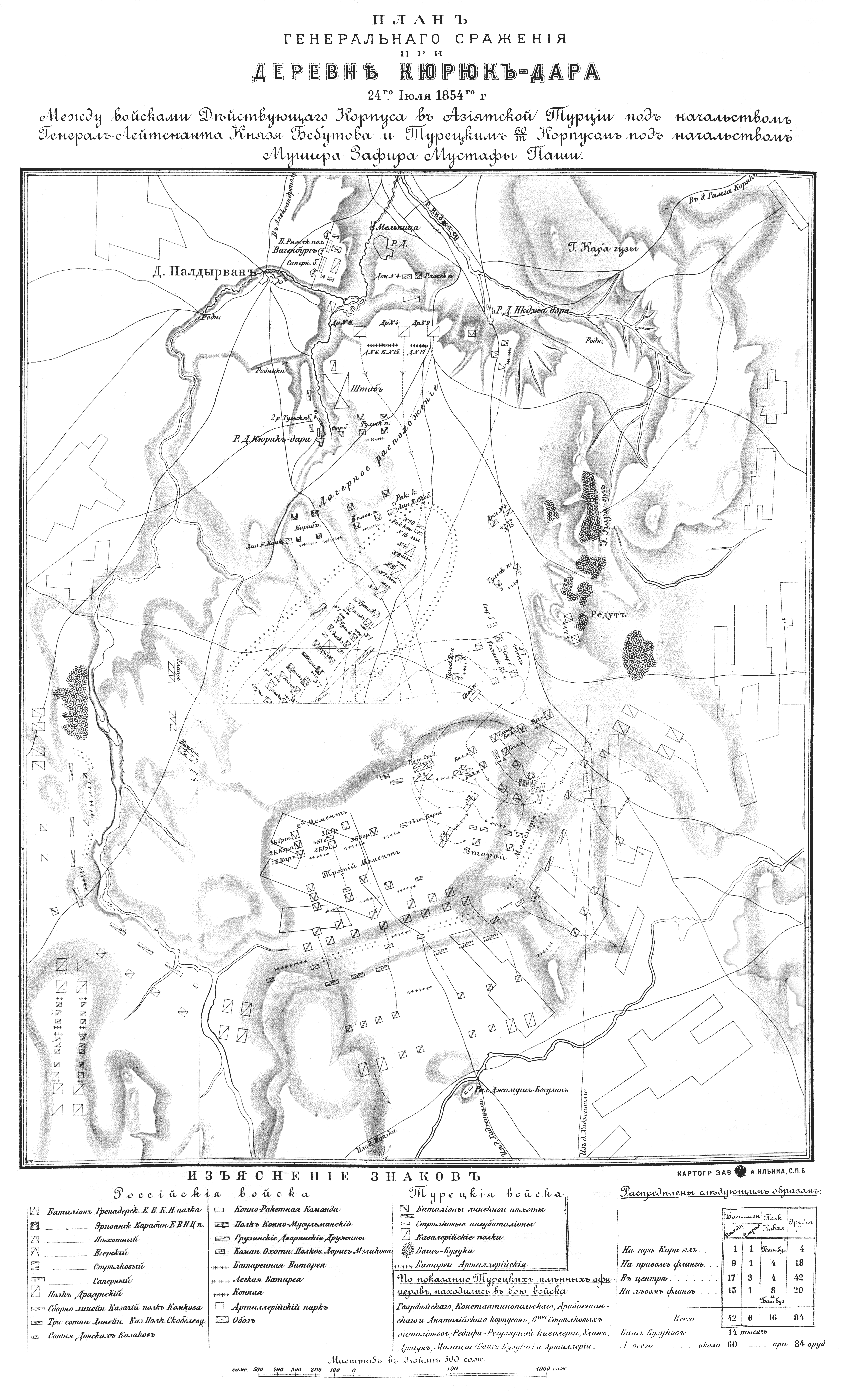 План генерального сражения при деревне Кюрюк-Дара 24 июля 1854 года. Между войсками Действующего Корпуса в Азиатской Турции под начальством Генерал-лейтенанта Князя Бебутова и Турецким 60-ти тысячным Корпусом под начальством Мушира Зафира Мустафы Паши