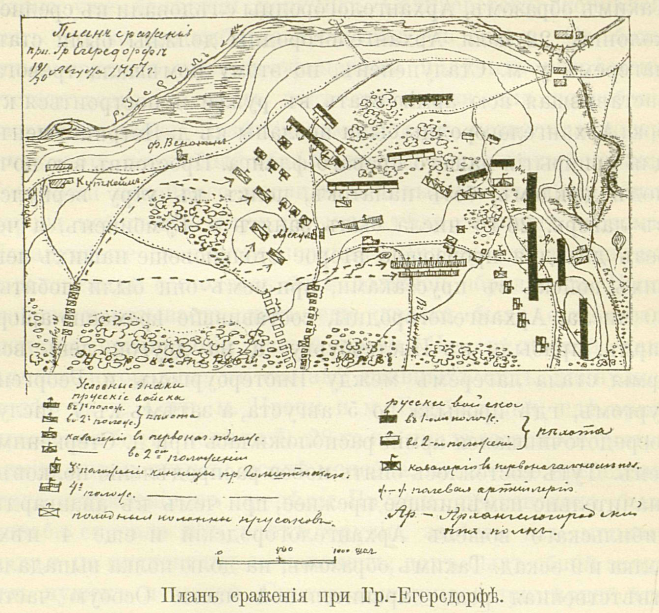 План сражения при деревне Гросс-Егерсдорф 19/30 августа 1757 года