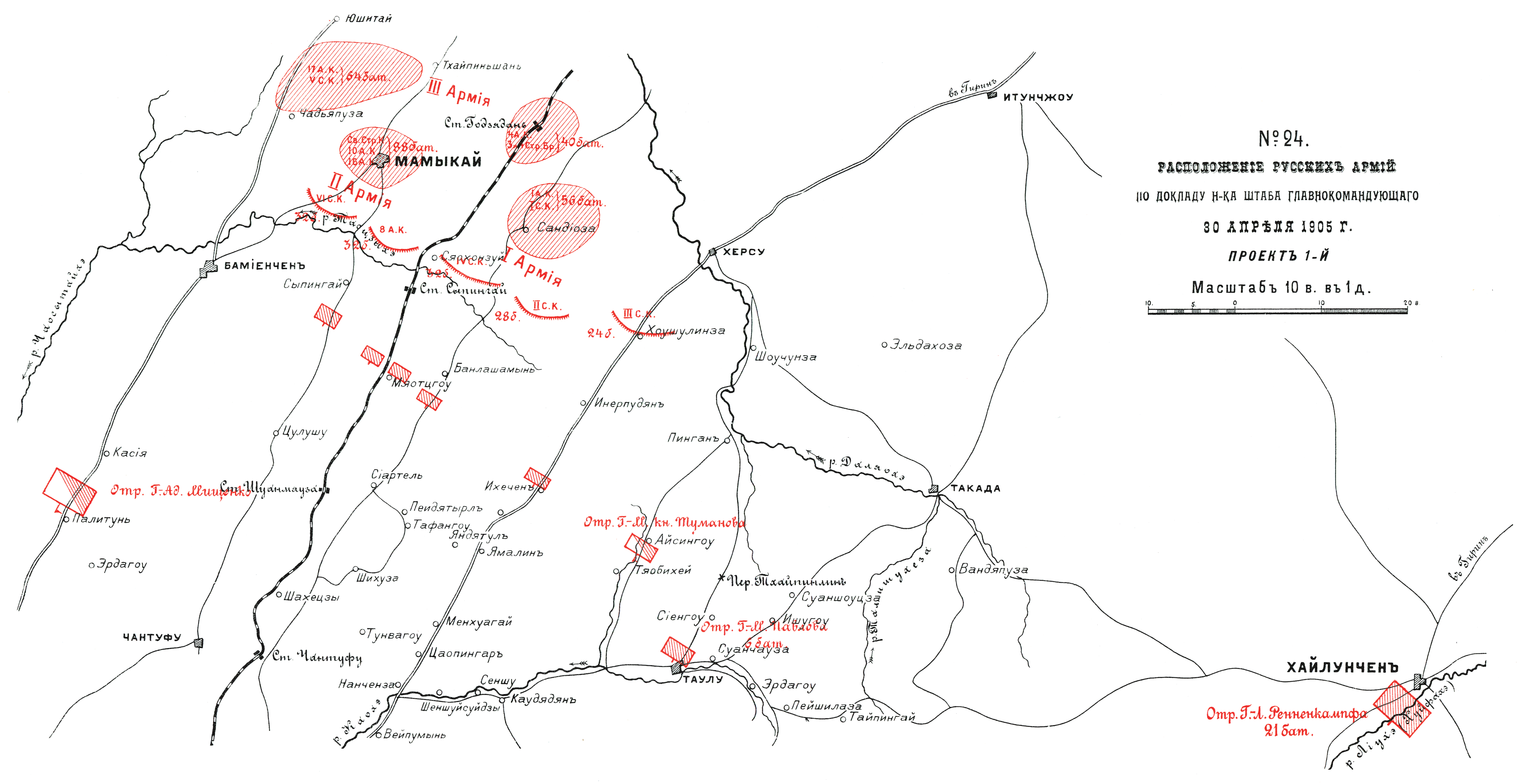 Расположение русских армий, по докладу Начальника Штаба Главнокомандующего 30 апреля 1905 года. Проект 1