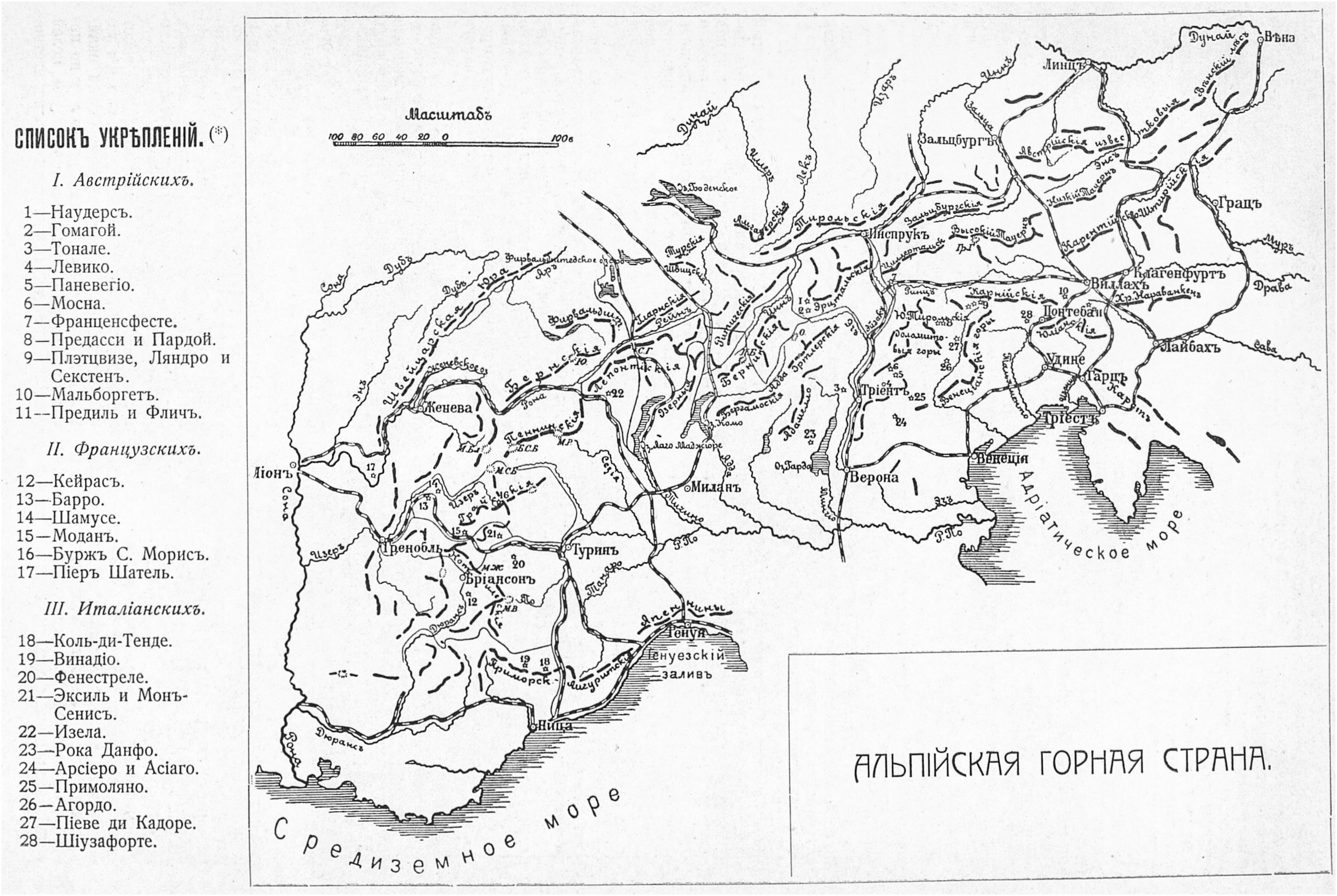 Альпийская горная страна и расположение австрийских, французских и итальянских укреплений.