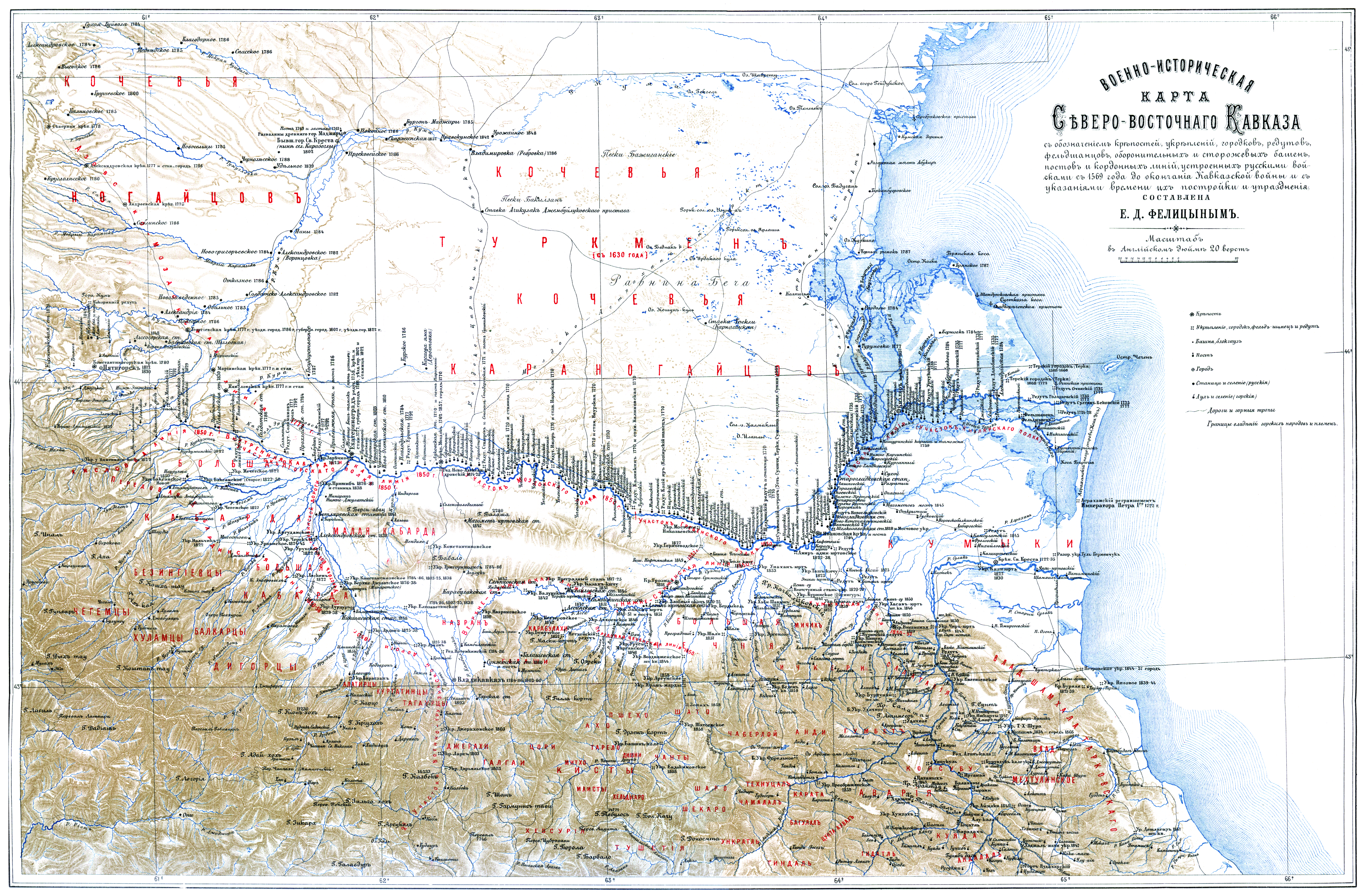 Военно-историческая карта Северо-восточного Кавказа с обозначением крепостей, укреплений, городков, редутов, фельдшанцев, оборонительных и сторожевых башен, постов и кордонных линий, устроенных русскими войсками с 1569 года до окончания Кавказской войны и