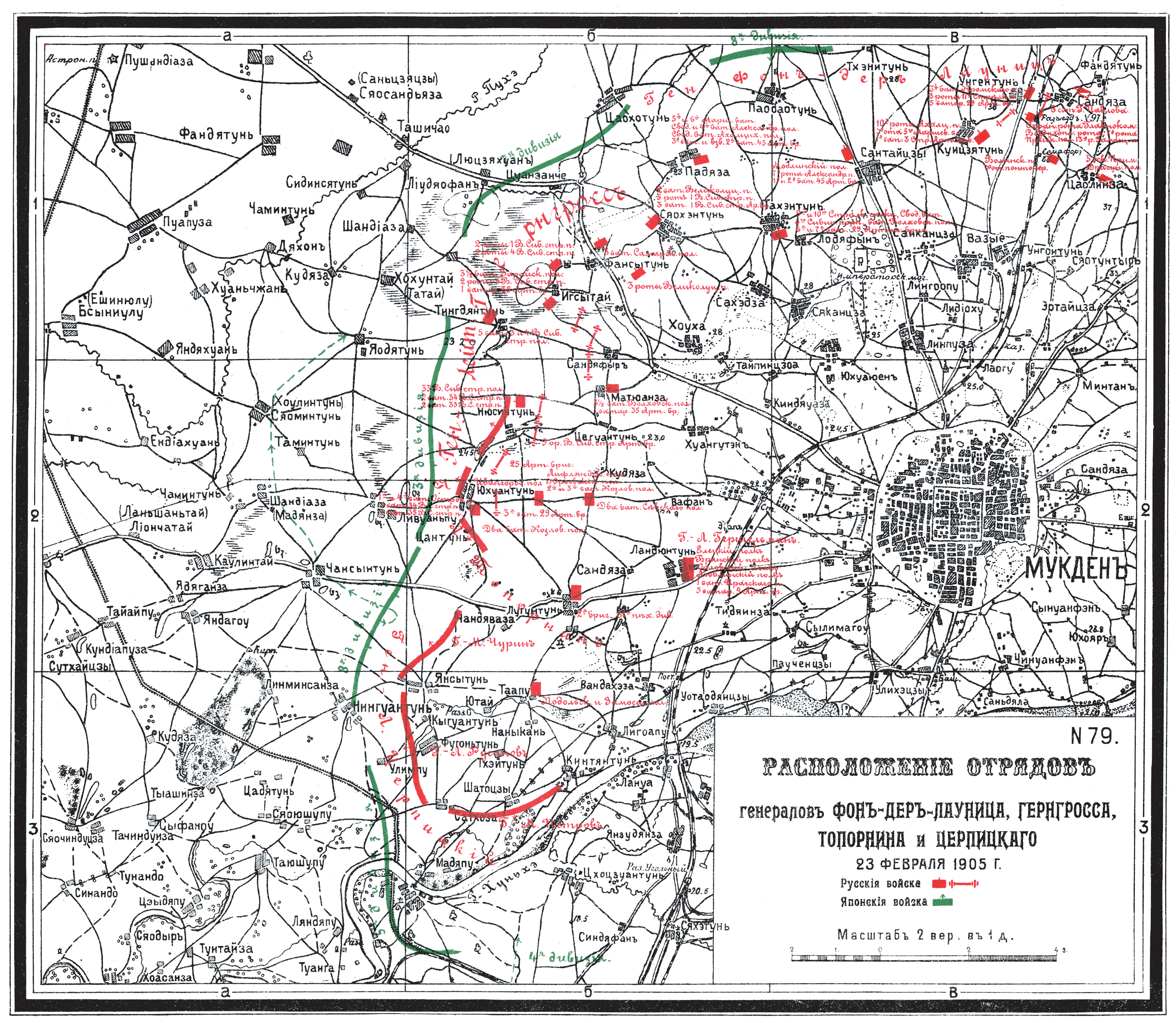 Расположение отрядов генералов фон-дер-Лауница, Гернгросса, Топорнина и Церпицкого 23 февраля 1905 года